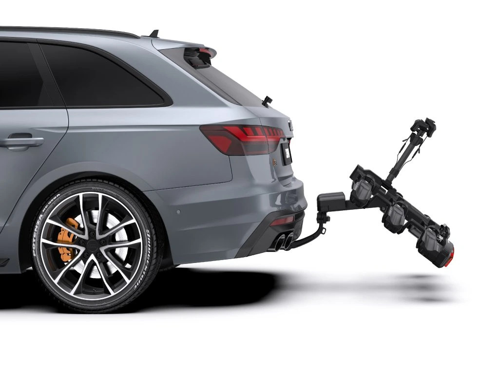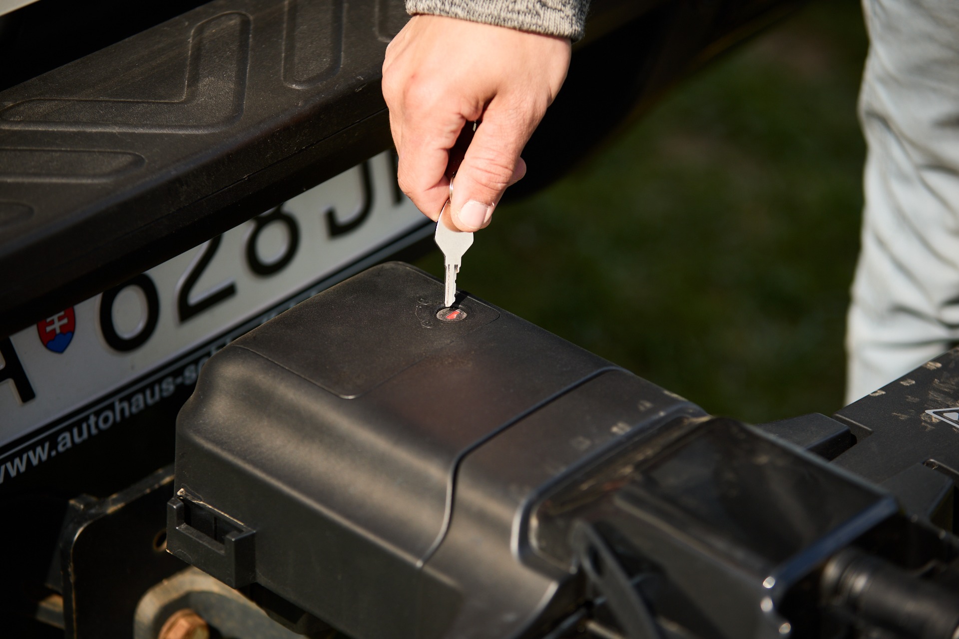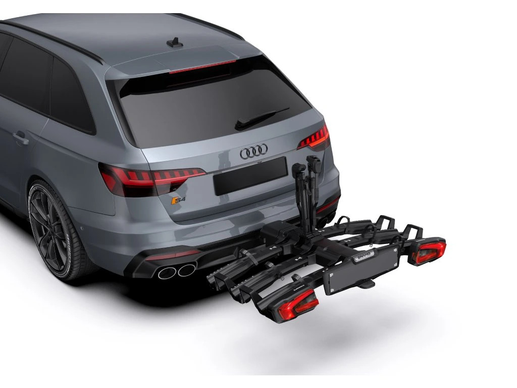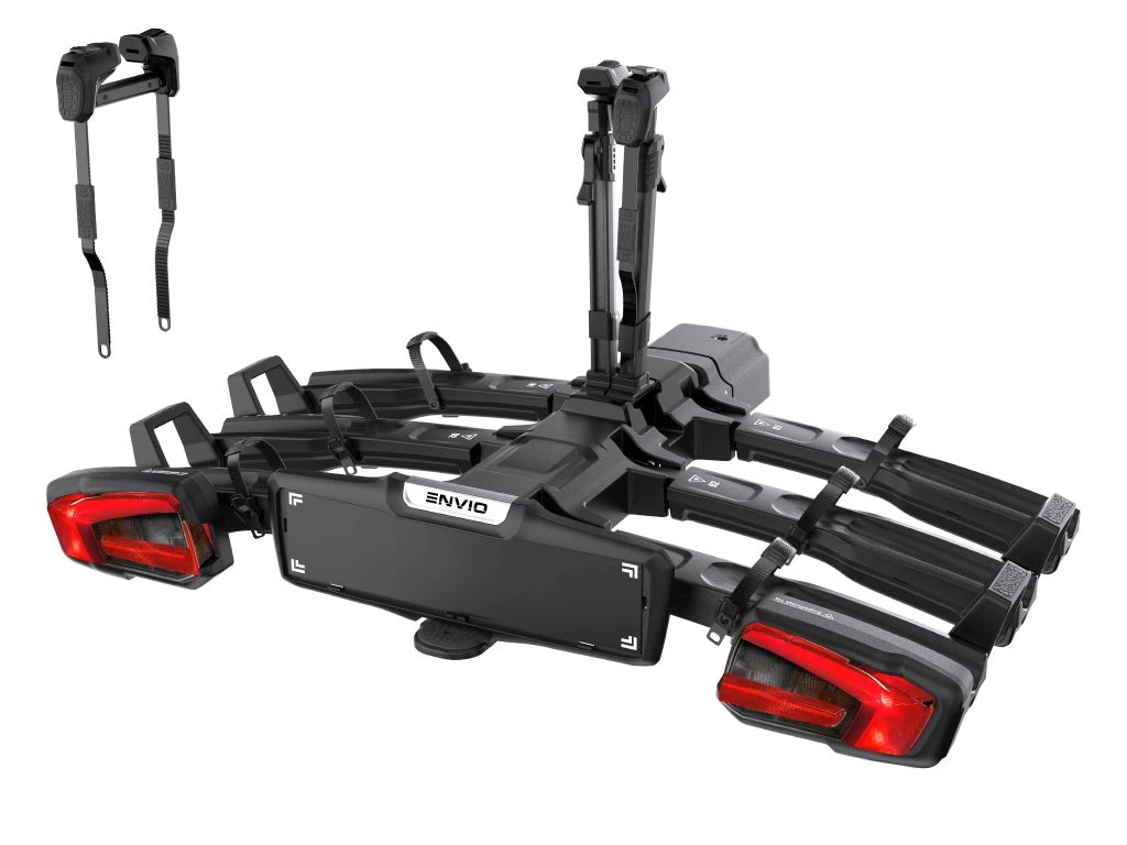 ENVIO eMAX 3 je robustní nosič kol na tažné zařízení pro 3 kola včetně elektrokol. Nabízí vysokou stabilitu, pevné uchycení a pohodlnou manipulaci při nakládání i používání. Díky sklopné konstrukci umožňuje pohodlný přístup do kufru i s naloženými koly.