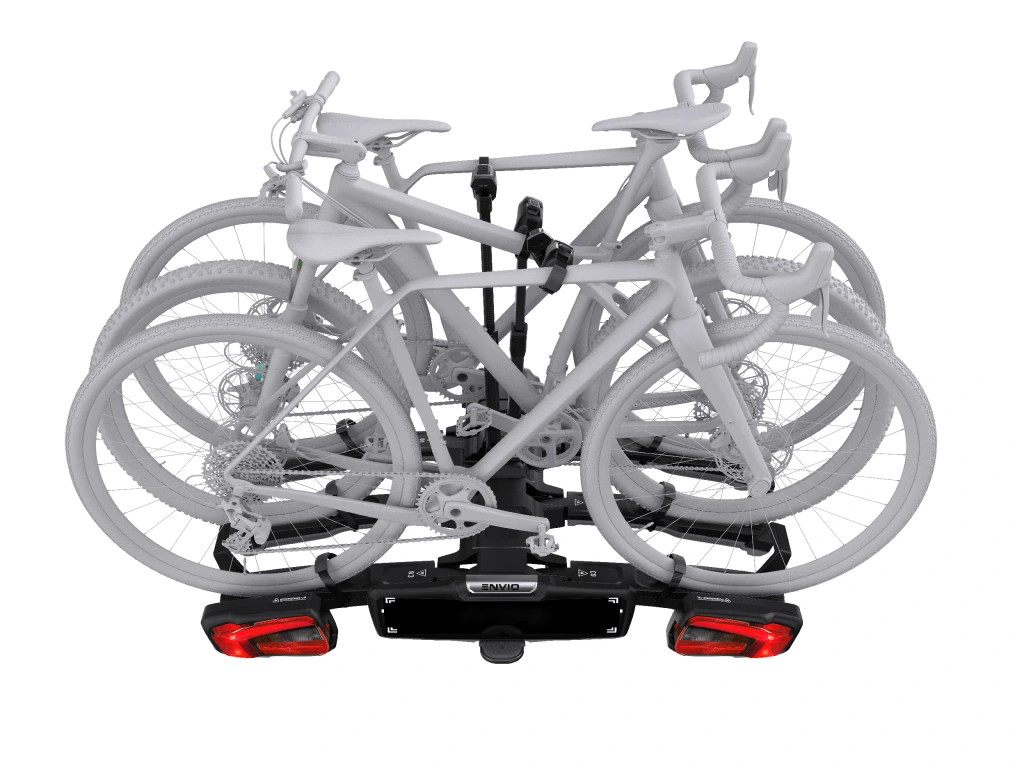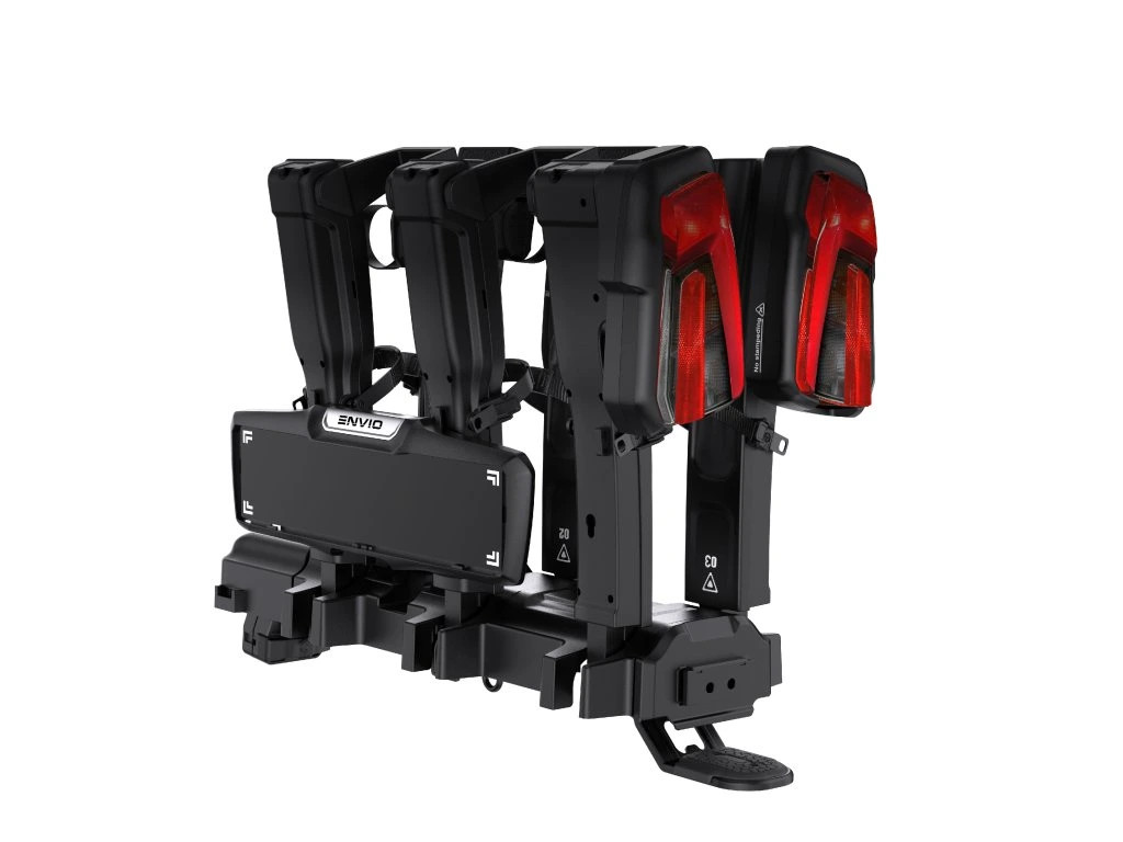 - Přeprava až 3 kol včetně elektrokol – nosič je vhodný pro běžné používání, ale zároveň nabízí rezervu pro zákazníky, kteří požadují vyšší nosnost a možnost bezpečné přepravy těžších kol. Robustní provedení a potvrzená nosnost až 85 kg dělají z modelu ENVIO eMAX 3 vhodné řešení i tam, kde běžné nosiče už svou kapacitou nebo nosností nestačí.