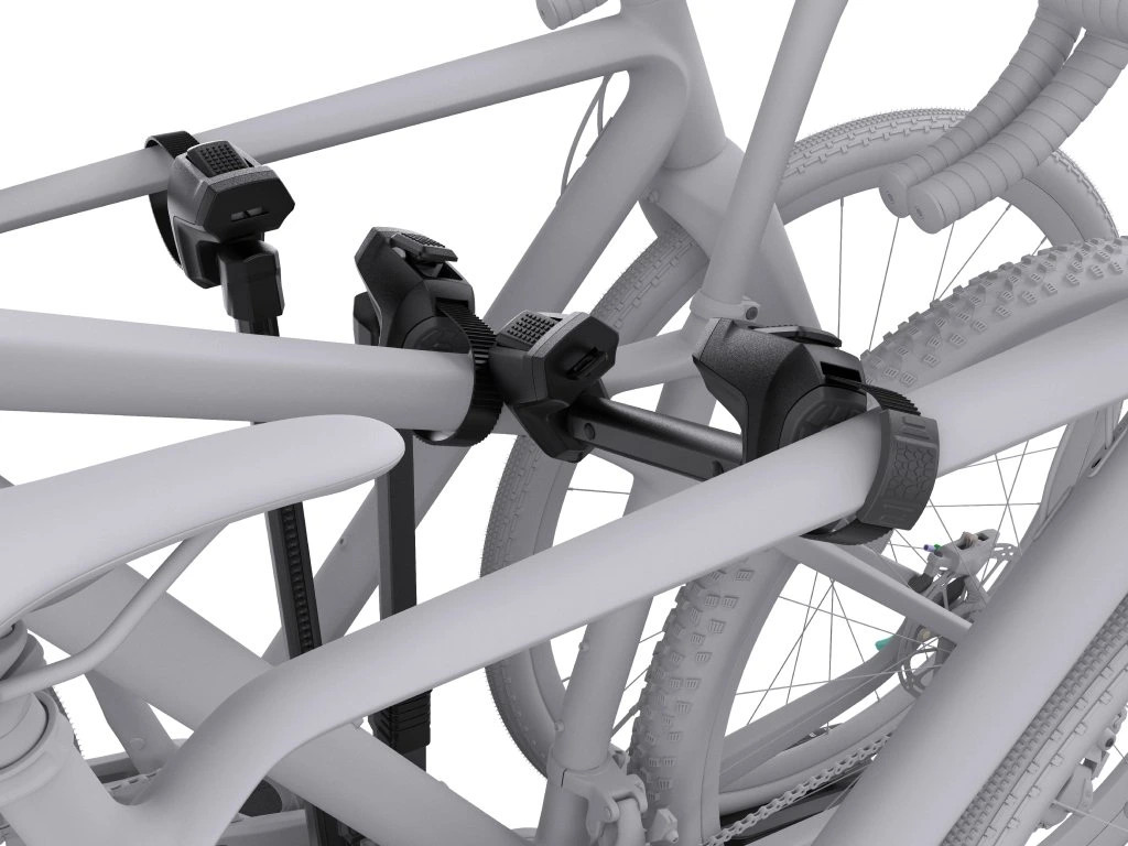 - Praktický systém upevnění kol – teleskopická ramena usnadňují upevnění 1. a 2. kola a přinášejí větší flexibilitu při různých typech rámů. Třetí kolo se fixuje pomocí spojovacího ramene ke druhému kolu, čímž se zajišťuje jeho uchycení v rámci celé sestavy.